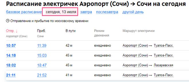 | Номер | Маршрут | Отправление | Прибытие | В пути | Расписание | Ж/д билеты |